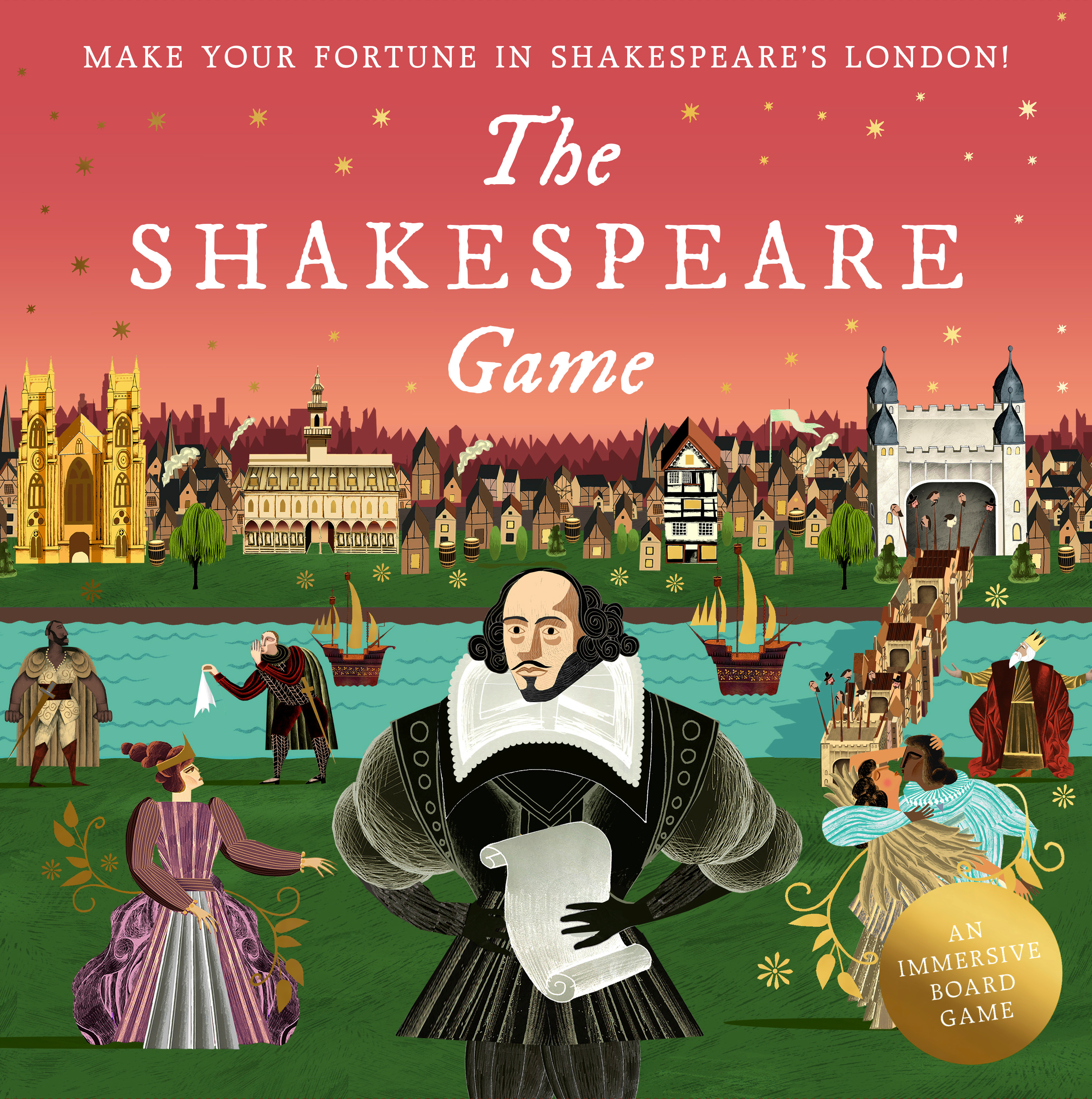 Journey from Stratford to London in the footsteps of the world's best loved playwright, collect characters and race round London's theatres to put on as many plays as you can before other playwrights steal your ideas, burn down your theatres or spread the plague! In this fun family board game, you will absorb details of Elizabethan England as well as learn loads of references to Shakespeare's plays. The winner is the player whose plays take the most money at the box office, and the fastest in the race to fame and glory.