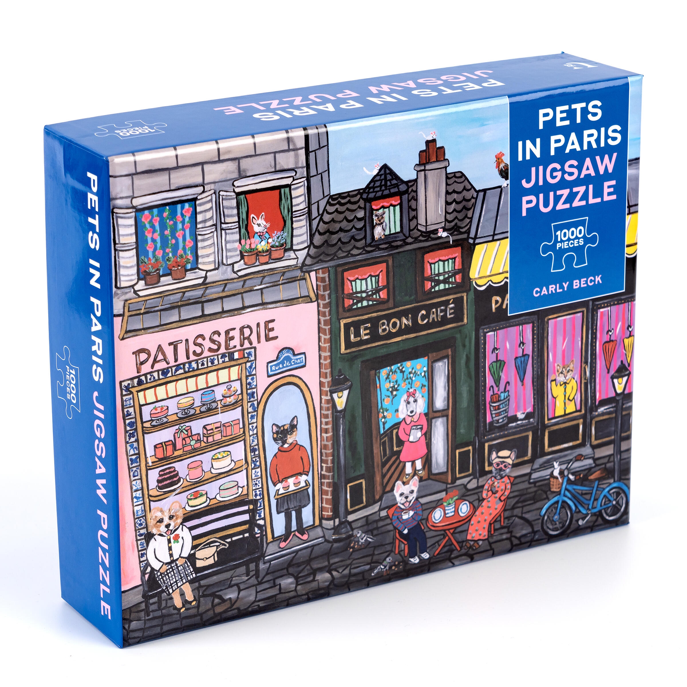 A 1,000-piece jigsaw puzzle featuring pets on a Parisian street, dressed in the finest French fashion. Acrylic artist Carly Beck paints a custom piece to create this comical, whimsical, and adorable 1,000-piece puzzle. The puzzle features dogs and cats in dapper clothing in a fancy Parisian scene.