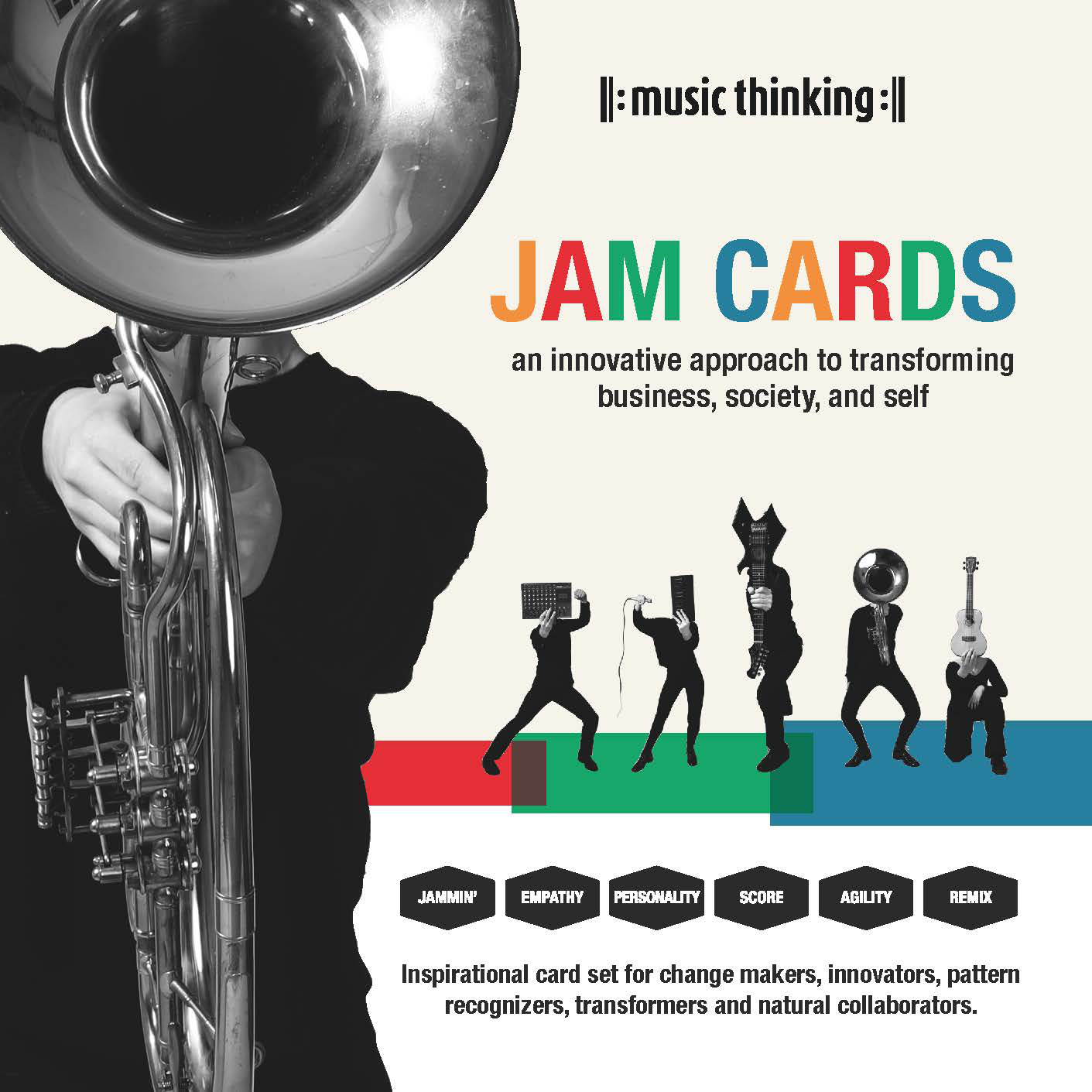 The Music Thinking Jam Cards contain inspirations from the big world of music for business, society and yourself. The card set consist of 38 inspiration cards and six cue cards. All inspiration cards have a keyword, a key visual, a trigger question, an inspirational quote, a link to a musical piece on Spotify and six cues that connect with the 6 cues of the Music Thinking Framework (shortly explained in the booklet). Music Thinking is the quest for the ultimate remix of empathy & strategy, plan & performance, thoughtfulness & playfulness, inspiration & transpiration, business & the arts. But first of all, it is a mentality in meaningful collaboration. There is no right way to have a jam card session, you can use them individually or with a group of people.