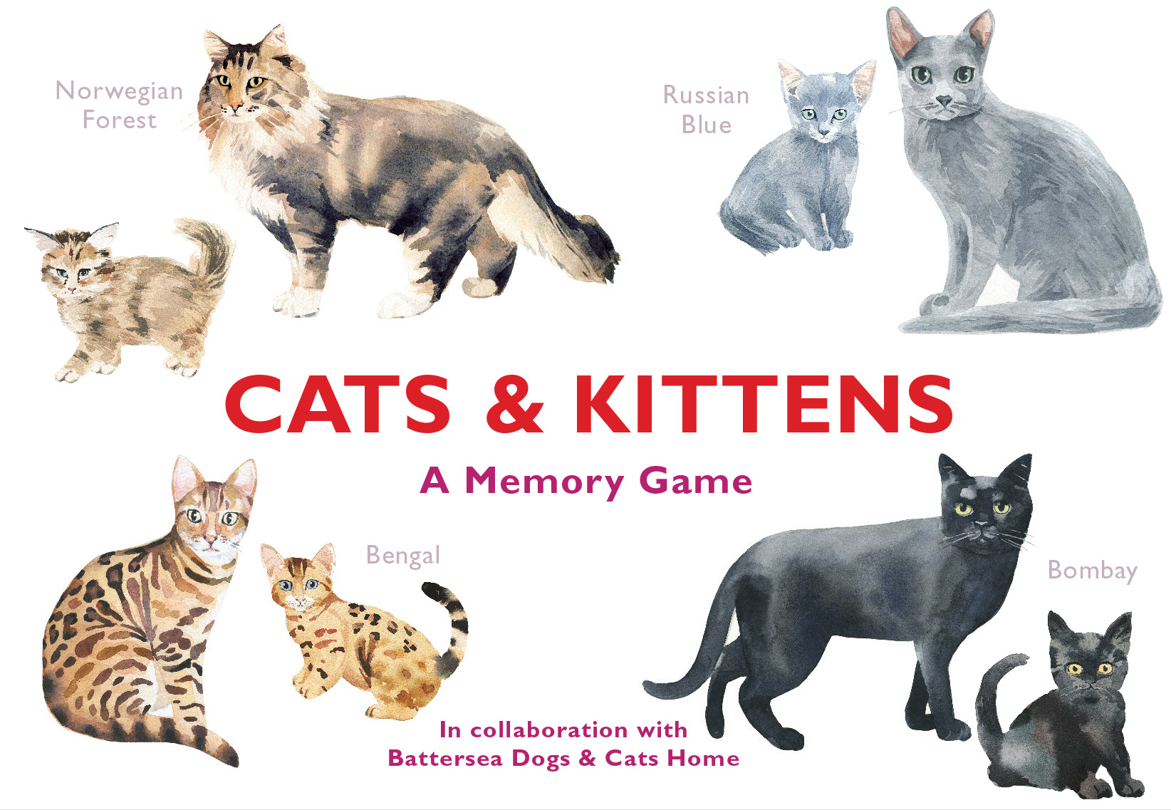 Match the cats and kittens of 25 breeds from around the world in this beautifully illustrated memory game. To play, simply place the cards face down and see if you can remember where the mother cat and her kitten are located. Collect more pairs than your opponent to win!