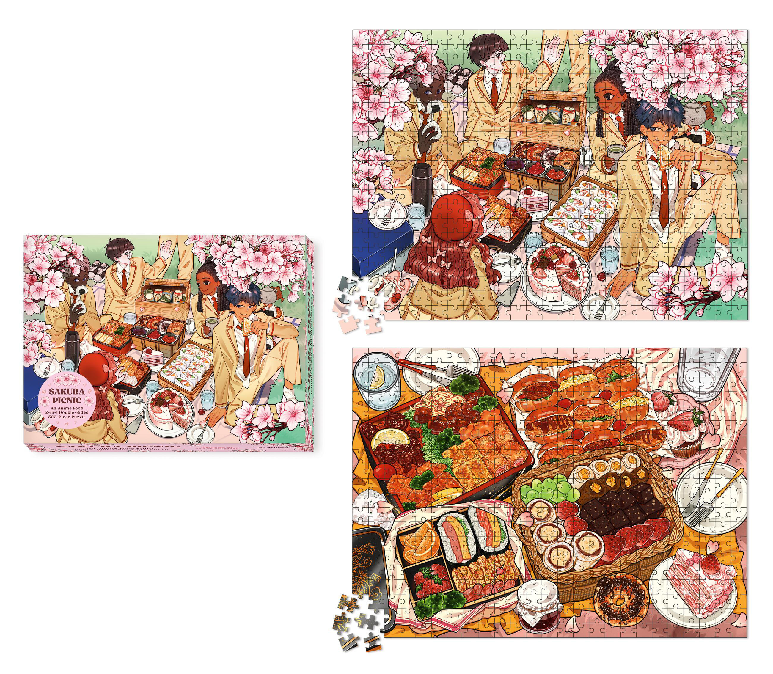 * Fully Illustrated Package: This puzzle and deluxe box features two illustrated scenes: friends enjoying a haniami, a cherry blossom viewing picnic, and a close up of the delicious dishes including bentos, rice balls, strawberry cake, and other anime food staples.