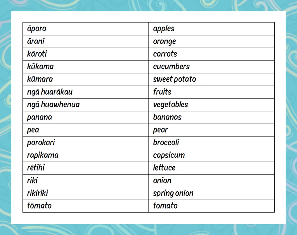 Spread 5: Ngā huarākau me ngā huawhenua, Fruit and vegetable section
