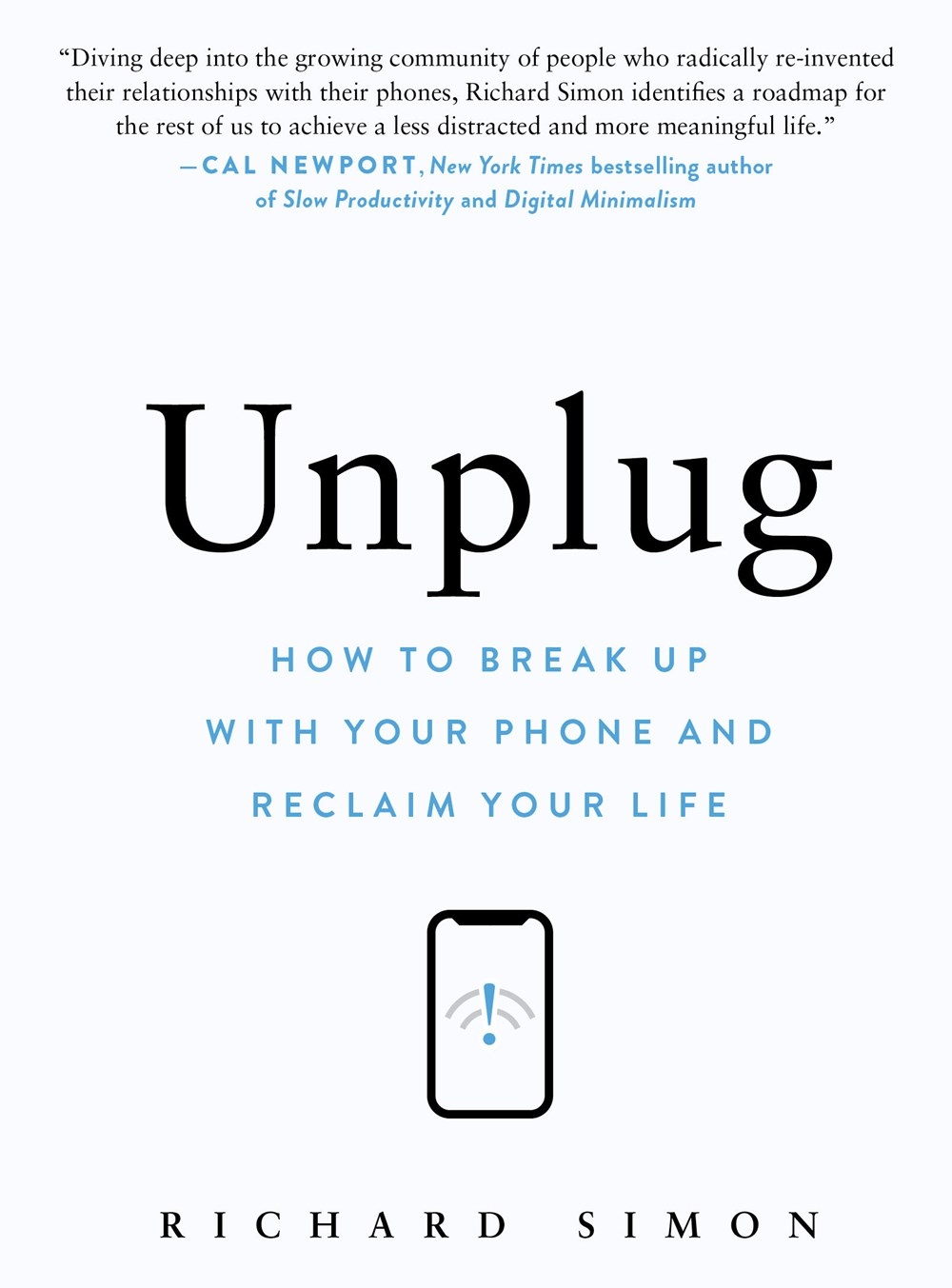 In Unplug, Richard Richard Simon lays out a plan to detox from your phone, including different breakup styles, things to do with your newfound time, lightly reintegrating a smartphone into your life, and finally, helping others quit. These tips and strategies are interspersed with success stories, including Simon's own story of turning off his phone for a whole year, plus those of 29 others, including a professional baseball player (Nick Castellanos), bestselling authors on digital usage and addiction (Cal Newport and Ed Spector, respectively), physicians who specialize in digital wellness, as well as ordinary folks including a principal, a pastor, and a couple who quit their phones together.