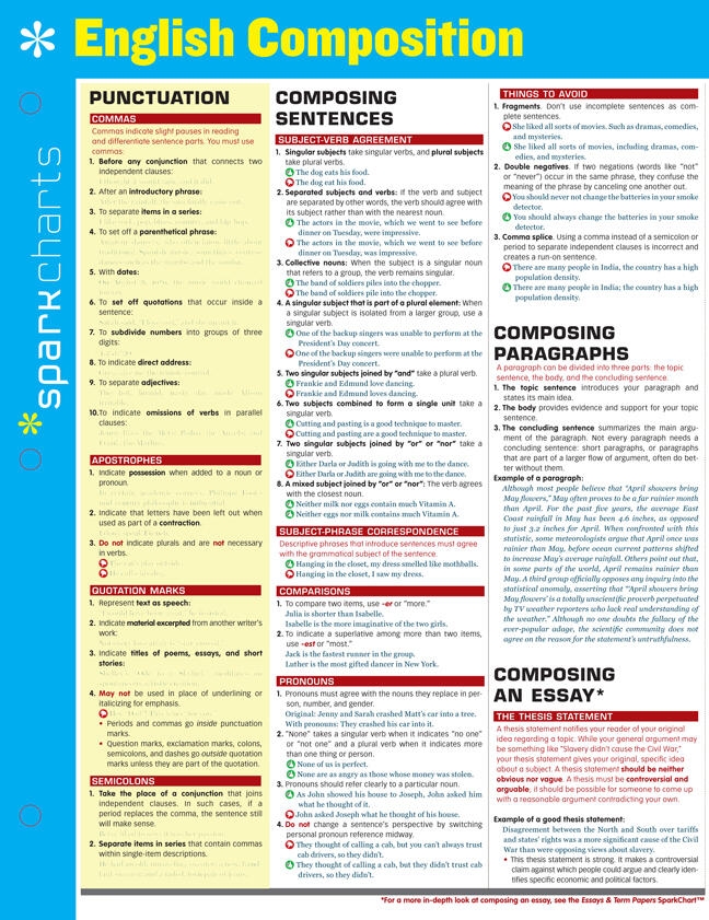 SparkCharts :The information you need-concisely, conveniently, and accurately. Created by Harvard students for students everywhere, these study companions and reference tools cover a wide range of college and graduate school subjects, from Business and Computer Programming to Medicine, Law, and Languages. Theyll give you what it takes to find success in school and beyond. Outlines and summaries cover key points, while diagrams and tables make difficult concepts easier to grasp.This four-page chart covers: Punctuation uses Help with composing sentences, paragraphs, and essays Guidelines on style A list of commonly confused words and phrases, with examples A table of irregular verbs A list of commonly misspelled words