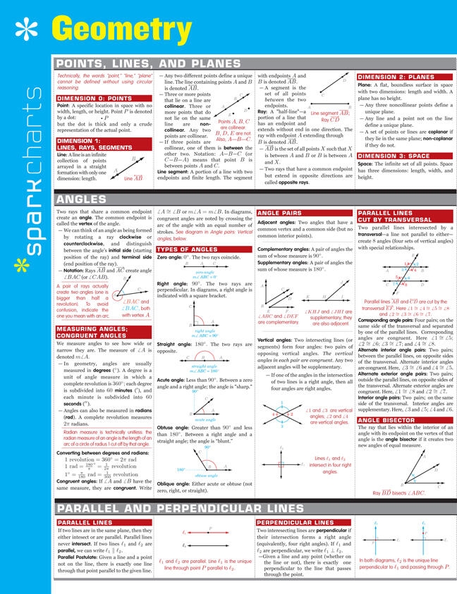 SparkCharts :The information you need-concisely, conveniently, and accurately. Created by Harvard students for students everywhere, these study companions and reference tools cover a wide range of college and graduate school subjects, from Business and Computer Programming to Medicine, Law, and Languages. Theyll give you what it takes to find success in school and beyond. Outlines and summaries cover key points, while diagrams and tables make difficult concepts easier to grasp.This six-page chart reviews: Points, lines, and planes Angles Parallel and perpendicular lines Distance and polygons in the plane Quadrilaterals, triangles, and circles Lines and planes in space Solids in space definitions and reference table