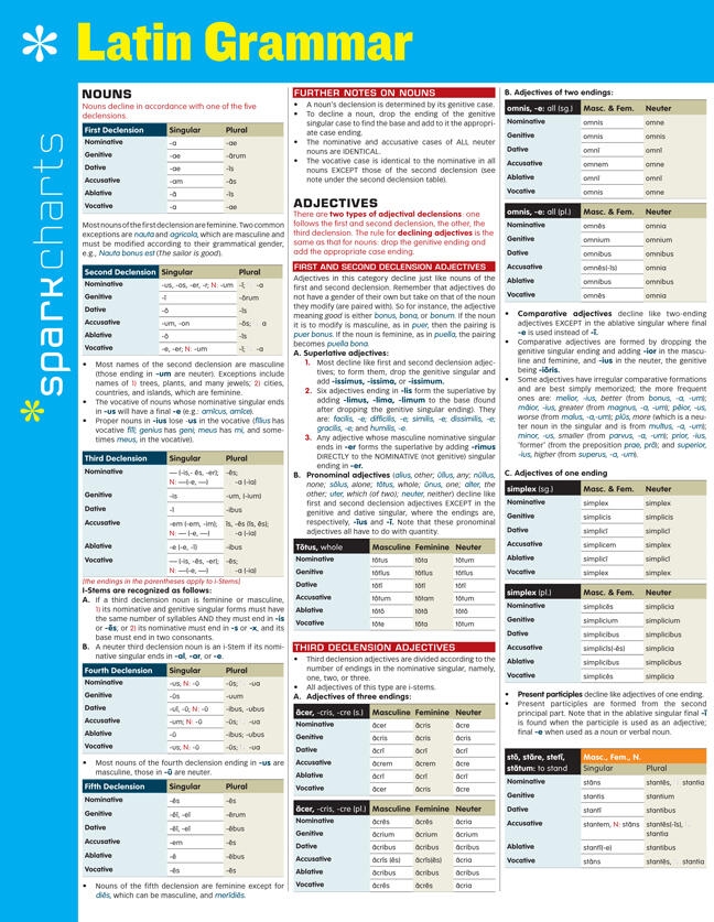 SparkCharts :The information you need-concisely, conveniently, and accurately. Created by Harvard students for students everywhere, these study companions and reference tools cover a wide range of college and graduate school subjects, from Business and Computer Programming to Medicine, Law, and Languages. Theyll give you what it takes to find success in school and beyond. Outlines and summaries cover key points, while diagrams and tables make difficult concepts easier to grasp. This six-page chart reviews: Nouns Adjectives Pronouns Verb tenses and conjugations Adverbs Use of cases Grammatical constructions