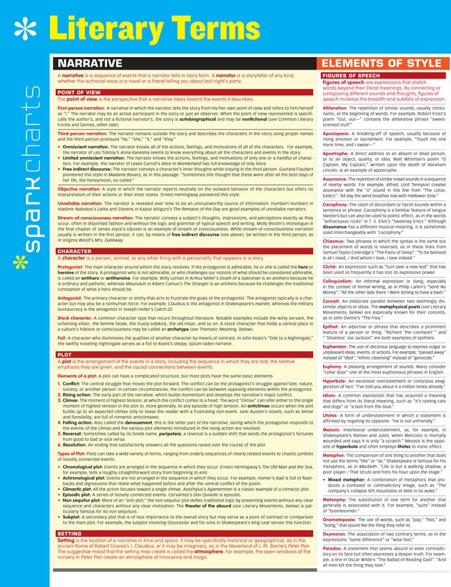 SparkCharts :The information you need-concisely, conveniently, and accurately. Created by Harvard students for students everywhere, these study companions and reference tools cover a wide range of college and graduate school subjects, from Business and Computer Programming to Medicine, Law, and Languages. Theyll give you what it takes to find success in school and beyond. Outlines and summaries cover key points, while diagrams and tables make difficult concepts easier to grasp.This six-page chart covers the following topics: Narrative Elements of Style Poetry Common Literary Forms and Genres Literary Movements and Periods Literary Theory and Criticism