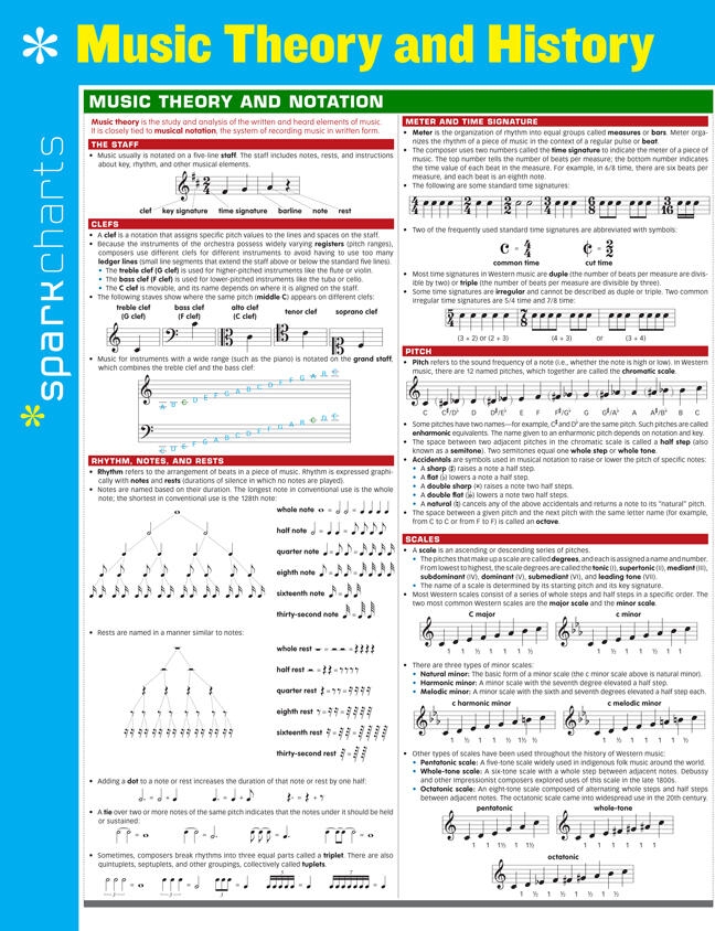 SparkCharts :The information you need-concisely, conveniently, and accurately. Created by Harvard students for students everywhere, these study companions and reference tools cover a wide range of college and graduate school subjects, from Business and Computer Programming to Medicine, Law, and Languages. Theyll give you what it takes to find success in school and beyond. Outlines and summaries cover key points, while diagrams and tables make difficult concepts easier to grasp.This six-page chart covers: Music theory and notation (the staff, clefs, rhythm, meter, pitch, scales, keys, intervals, chords) Tempo, dynamics, expressions, and articulations Instruments and ensembles The orchestra Musical forms and genres Eras and movements in Western music Notable composers in Western music
