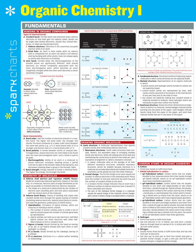 SparkCharts :The information you need-concisely, conveniently, and accurately. Created by Harvard students for students everywhere, these study companions and reference tools cover a wide range of college and graduate school subjects, from Business and Computer Programming to Medicine, Law, and Languages. Theyll give you what it takes to find success in school and beyond. Outlines and summaries cover key points, while diagrams and tables make difficult concepts easier to grasp. This four-page chart covers: Bonding in organic compounds Geometry of molecules Common atoms in organic chemistry Types of organic molecules and functional groups, including IUPAC rules Isomerism and stereochemistry Spectroscopy of organic molecules and the electromagnetic spectrum