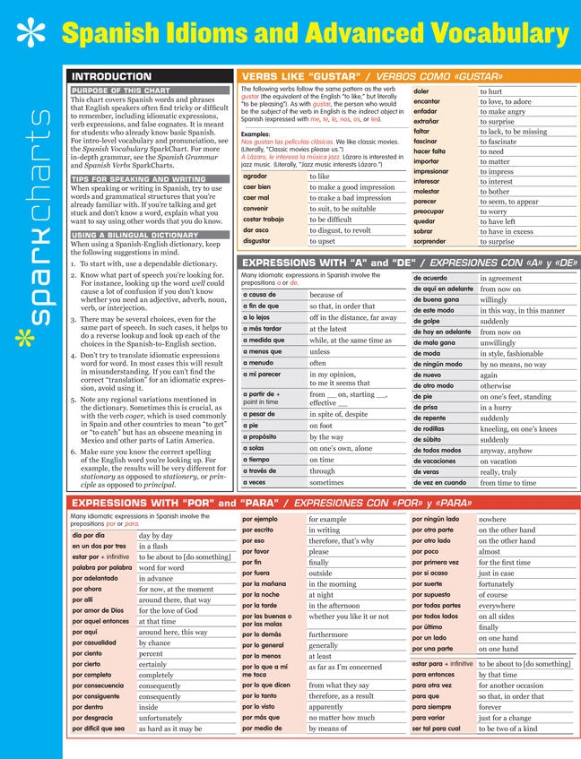 SparkCharts :The information you need-concisely, conveniently, and accurately. Created by Harvard students for students everywhere, these study companions and reference tools cover a wide range of college and graduate school subjects, from Business and Computer Programming to Medicine, Law, and Languages. Theyll give you what it takes to find success in school and beyond. Outlines and summaries cover key points, while diagrams and tables make difficult concepts easier to grasp. This four-page chart covers tricky, difficult, and otherwise advanced Spanish vocabulary and expressions: Verbs like gustar Expressions with a and de Expressions with por and para Idiomatic verb expressions Commonly confused words False cognates Regional variations and colloquialisms
