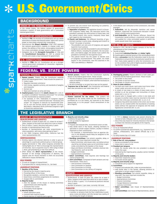 SparkCharts :The information you need-concisely, conveniently, and accurately. Created by Harvard students for students everywhere, these study companions and reference tools cover a wide range of college and graduate school subjects, from Business and Computer Programming to Medicine, Law, and Languages. Theyll give you what it takes to find success in school and beyond. Outlines and summaries cover key points, while diagrams and tables make difficult concepts easier to grasp. This four-page chart covers: The U.S. Constitution and Bill of Rights Federal powers and state powers Legislative branch: House of Representatives and Senate Executive branch: President, Vice President, and Officers Electing and removing the President Judicial Branch: The Supreme Court and notable decisions How a bill becomes a law The party system and historical parties The media and interest groups Campaign finance and elections