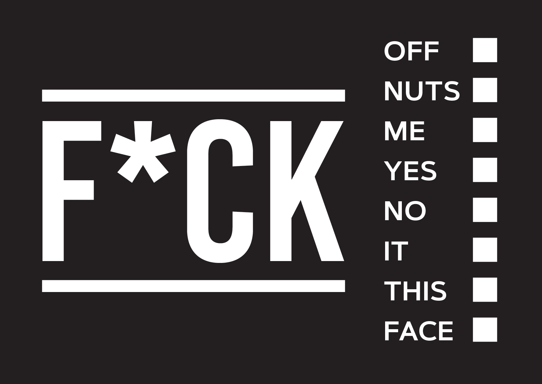 Tired of beating around the bush? Not one for subtlety? Tell people what you really think with these vulgar and versatile vouchers. Suitable for congratulation, commiseration, exasperation and everything in between. F*ck yes!